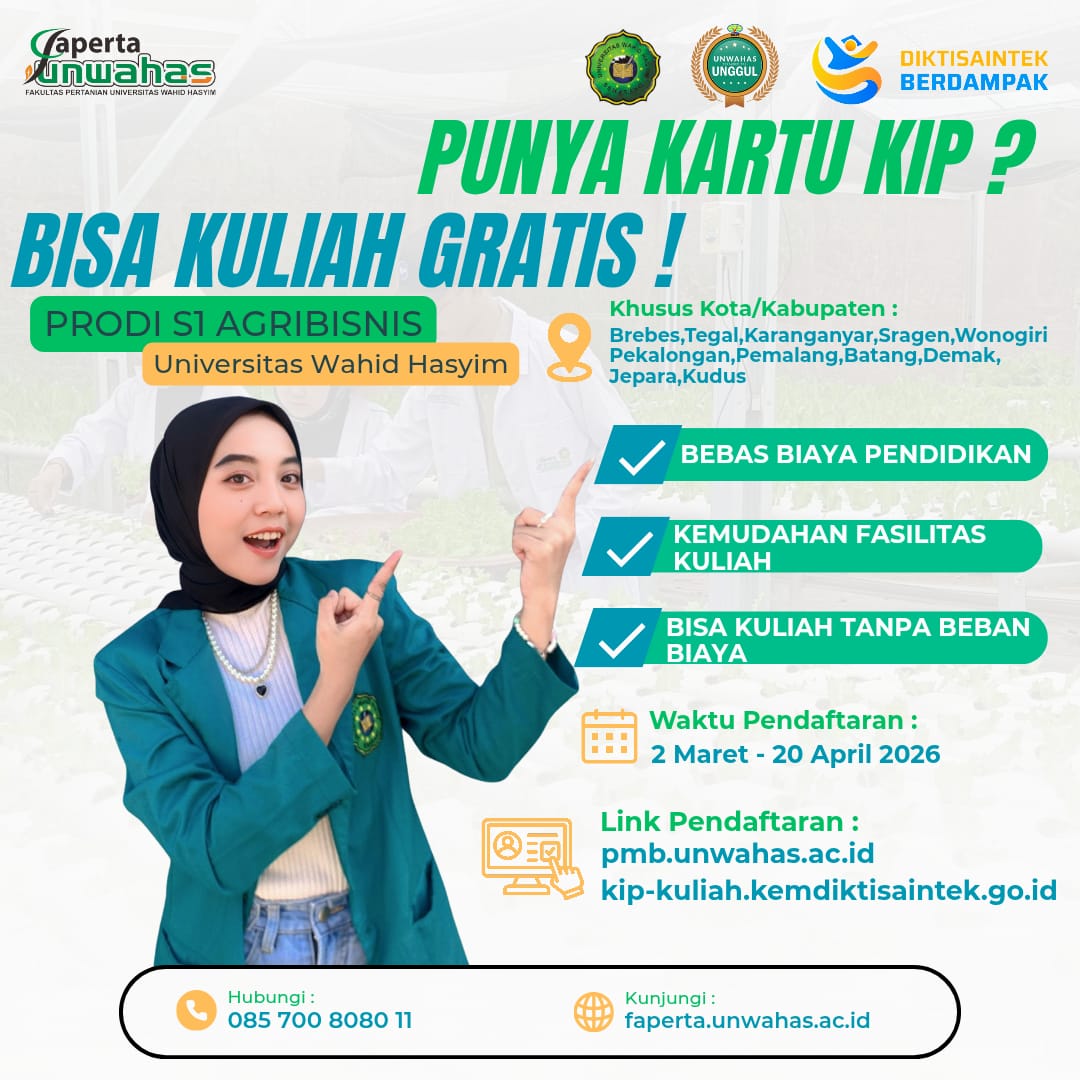 bagi rekan rekan yang memiliki kartu KIP/ masuk DTPS/ dari keluarga ekonomi kurang mampu, dapatkan kesempatan untuk kuliah dengan Beasiswa KIP di Program Studi Agribisnis Fakultas Pertanian Universitas Wahid Haysim Semarang.
